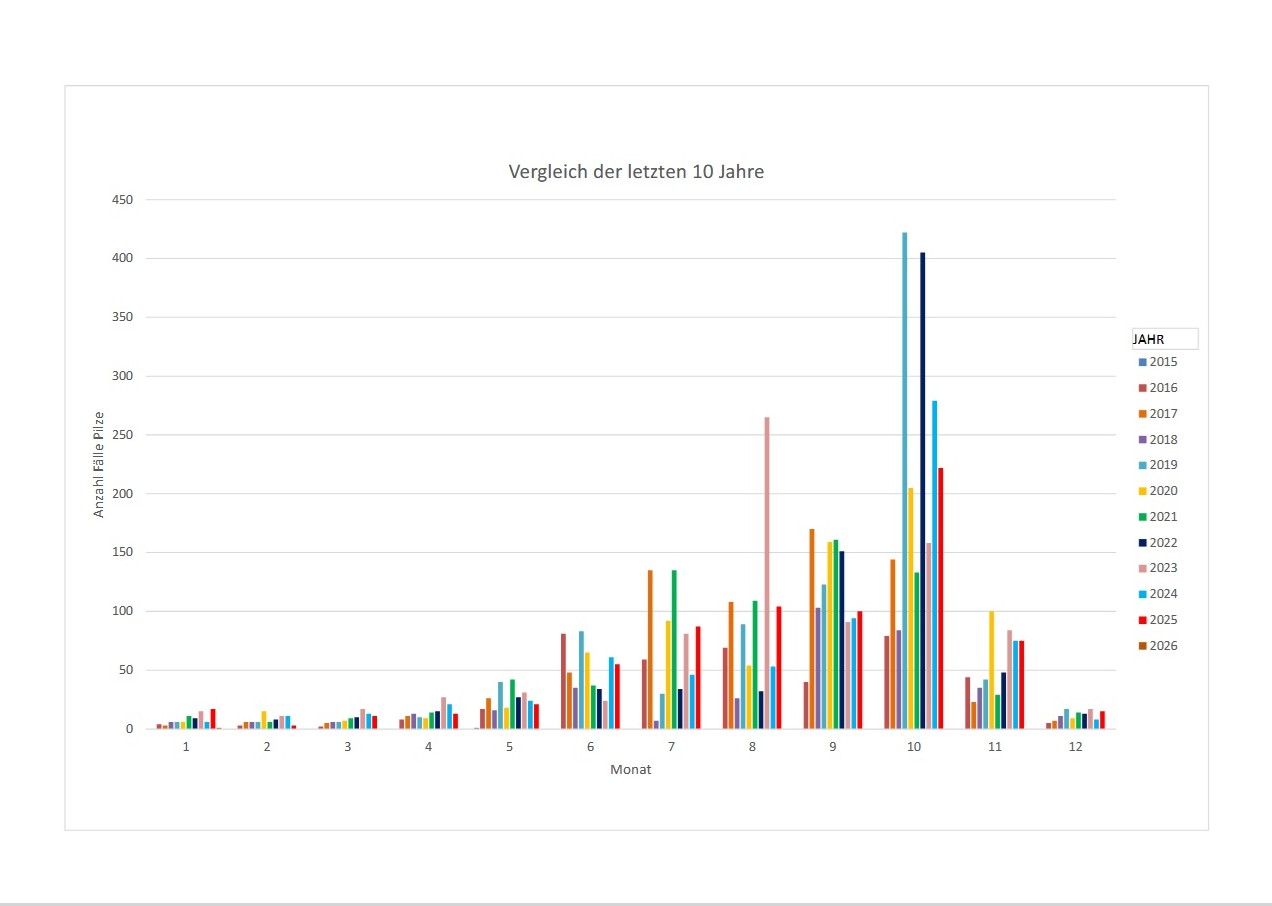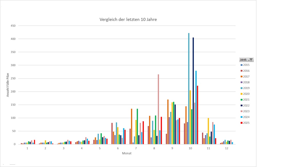 Durch Pilze verursachte Vergiftungen und Vergiftungsverdachtsfälle werden dem GIZ-Nord mit großer saisonaler Schwankung berichtet. Besonders viele Fälle gibt es jedes Jahr im Spätsommer und Herbst. Ein Vergleich der letzten 10 Jahre ist in folgender Grafik dargestellt.